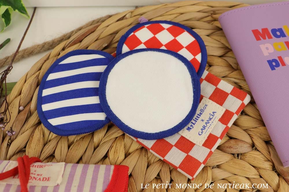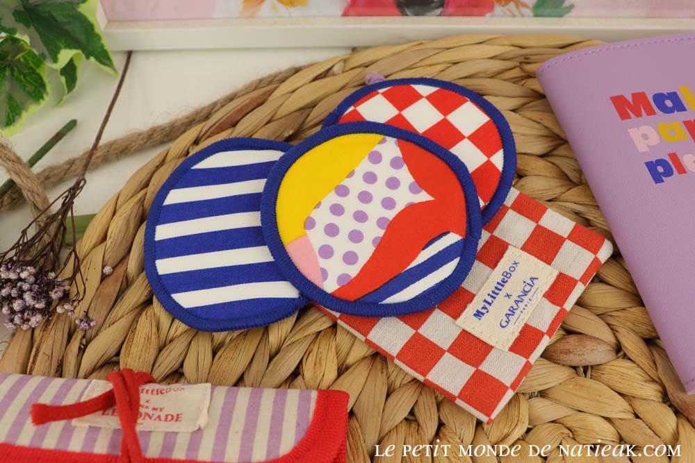 En beauté, Garancia nous offre trois lingettes lavables qui pourront nous servir pour le démaquillage. De formes arrondies, elles se présentent dans un petit pochon, parfait pour les transporter en vacance.
