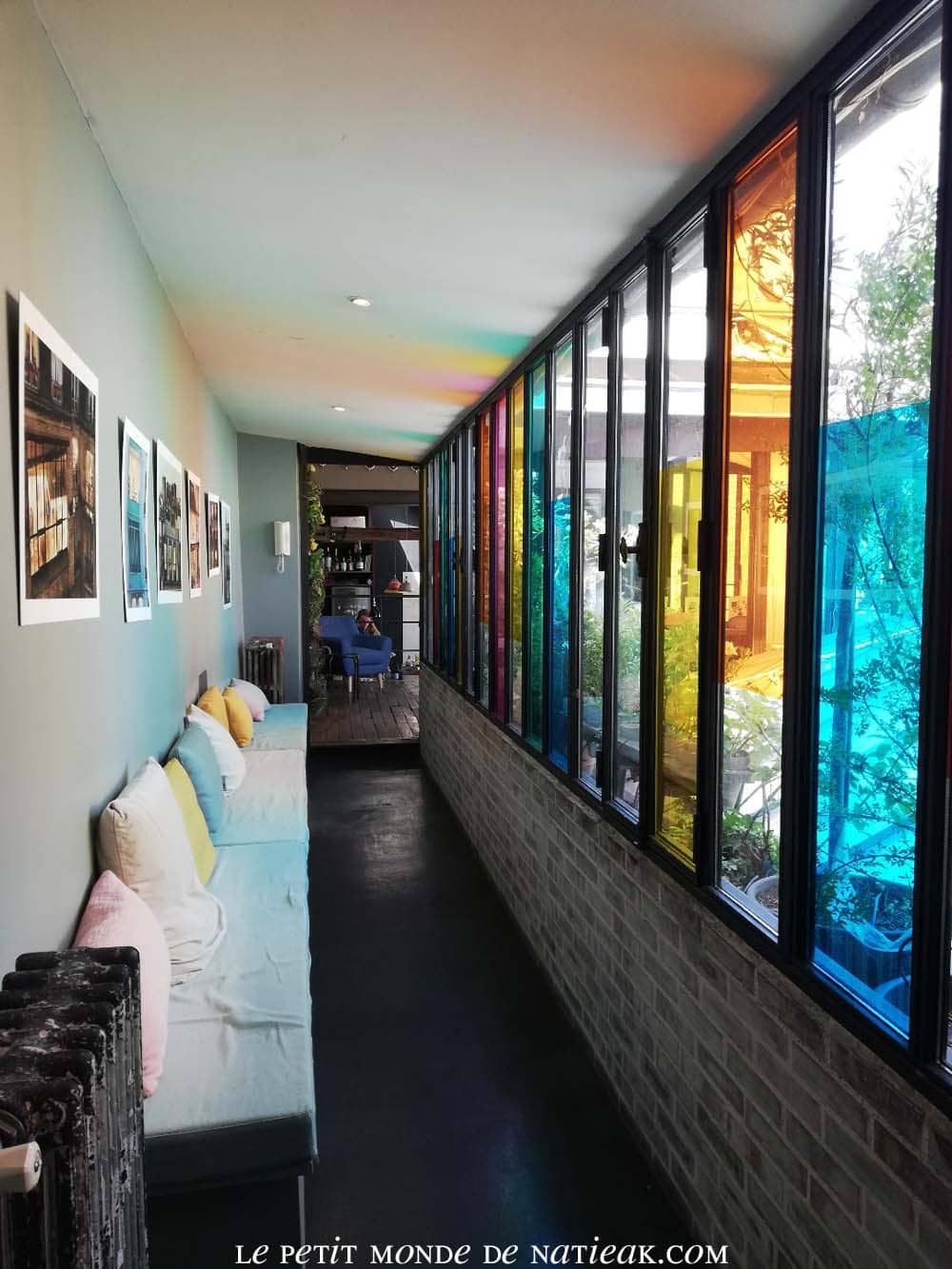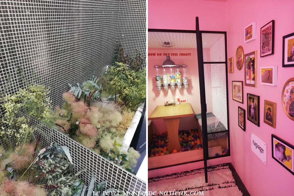 On ne pourra qu’être admirative devant le mur végétal réalisé avec des plantes artificielles, une décoration parfaite pour un appartement, car elle ne nécessaire aucun entretien. J’ai également eu un coup de cœur pour le couloir : des films colorés posés sur les vitres décomposent la lumière tel un arc-en-ciel.