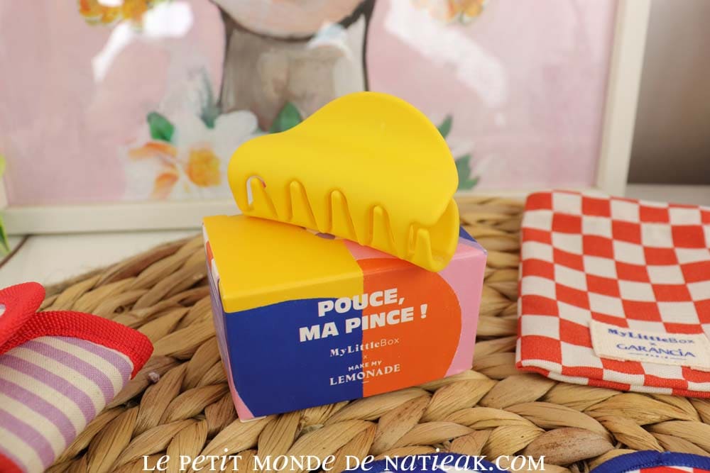 Pour les cheveux, une pince « anti cheveux dans les yeux » en plastique permettra de s’attacher les cheveux lors de nos différentes activités : je l’ai reçue en jaune, mais elle est également disponible en mauve. Elle offre un bon maintien même sur mes cheveux épais.