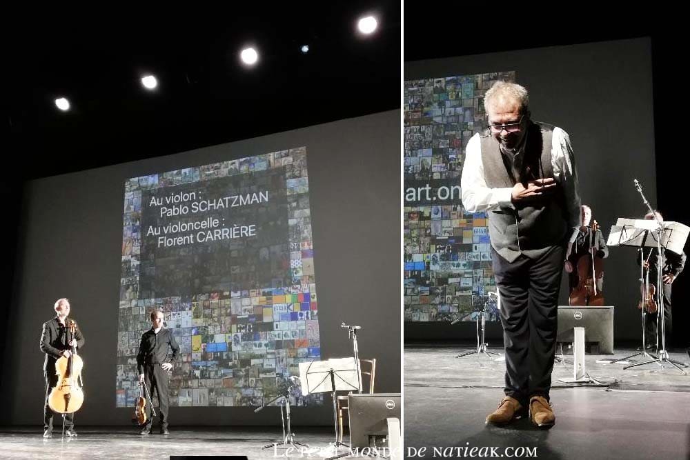 Sur scène : Hector Obalk, Raphaël PERRAUD au violoncelle, en alternance avec Florent CARRIÈRE. Pablo SCHATZMAN au violon, en alternance avec You-Jung HAN. Au chant Andréa CONSTANTIN ( non présent le jour de la représentation)