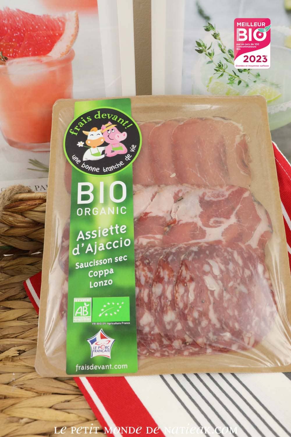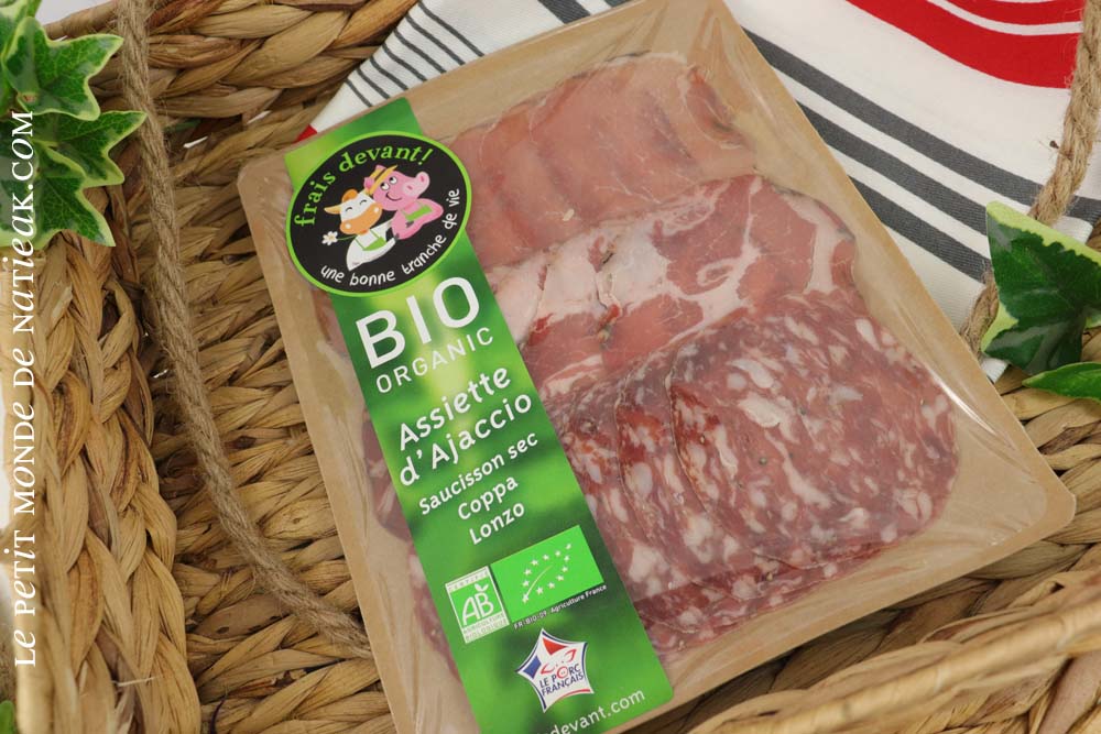 Commençons pour les produits alimentaires et notamment la charcuterie :  Bio organic propose l’Assiette d’Ajaccio de 90 gr, composée d’une association de saucissons secs, de Coppa et Lonzo, le tout bien évidemment certifiée AB porc français