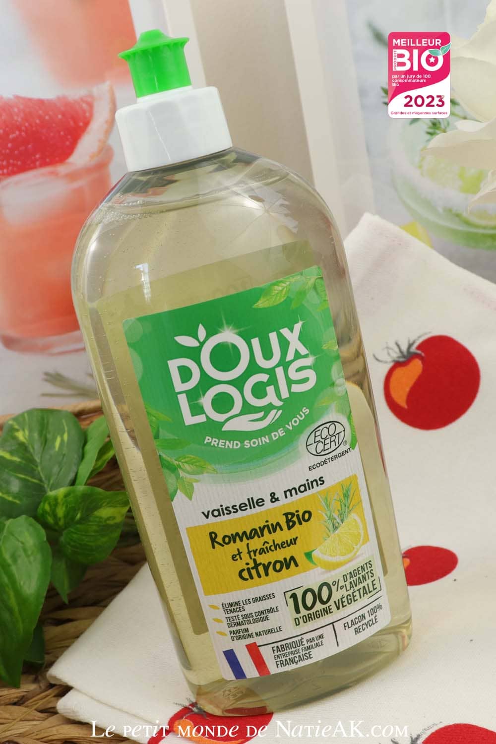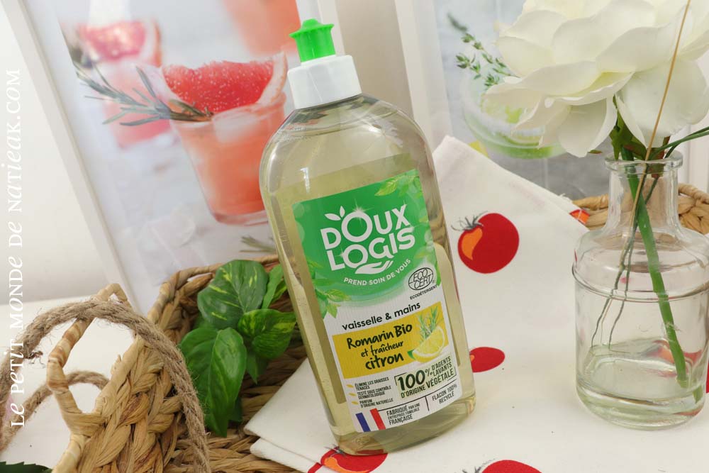En produit d’entretien, j’ai souhaité découvrir le produit vaisselle et mains de Doux Logis. J’ai été séduite par la composition végétale et le fait que le contenant soit issu de matières recyclées : c’est parfait pour la valorisation de nos déchets. Ce produit nettoyant offre une senteur aromatique et fraîche qui lave bien la vaisselle. Lorsque la vaisselle est trop grasse, le mieux est de la laisser tremper dans de l’eau chaude avec un peu de produit afin d’en facilité le dégraissage.