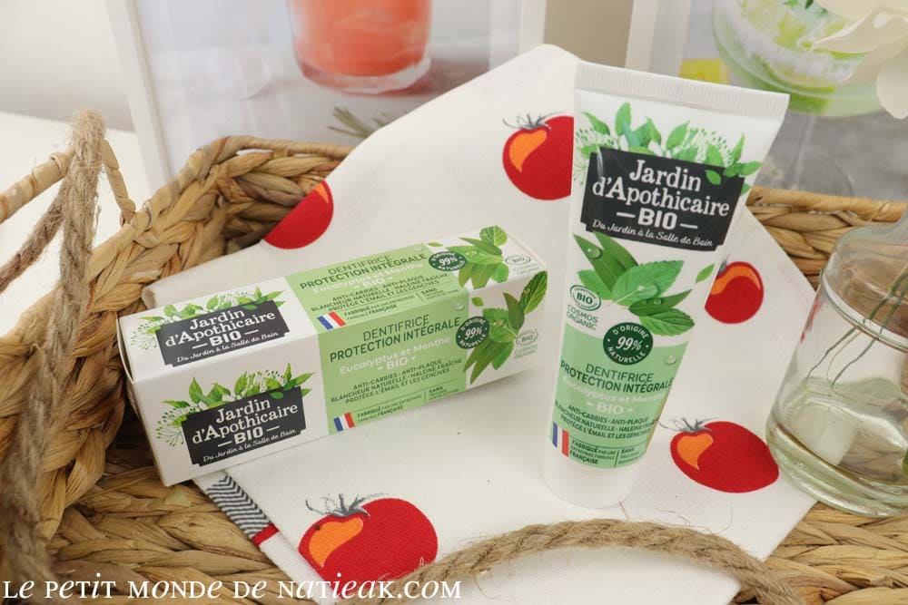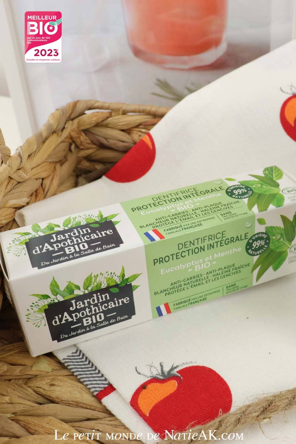 En hygiène, j’ai découvert le dentifrice protection intégrale eucalyptus et menthe poivré bio de Jardin d’apothicaire. C’est une marque que je connais, puisque j’avais eu l’occasion de vous partager mes impressions sur leurs soins d’hygiène sur mon site, mais également sur mon compte Instagram NatieAK (où je présentais justement ce dentifrice parmi trois autres soins d’hygiène).