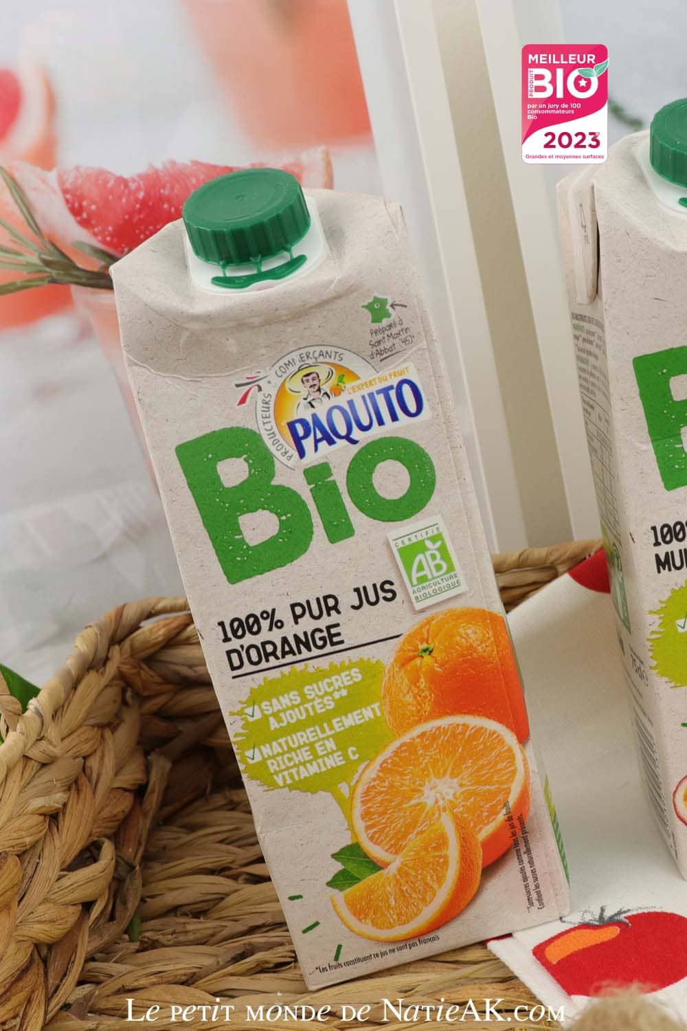 En jus de fruit, notre choix s’est porté sur le jus d’orange bio de la marque Paquito. Nous avons trouvé qu’il laissait en bouche un léger goût amer avec une point d’acidité.  Cela n’a pas répondu à mes attentes, ni à ceux de mes enfants car on ne retrouve pas le bon goût d’un jus d’orange 100 %. C’est triste, mais il ne se démarque pas d’un jus d’orange de marque distributeur. Pourtant, il a obtenu le prix Meilleur Bio 2023.