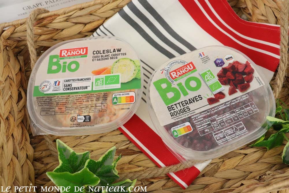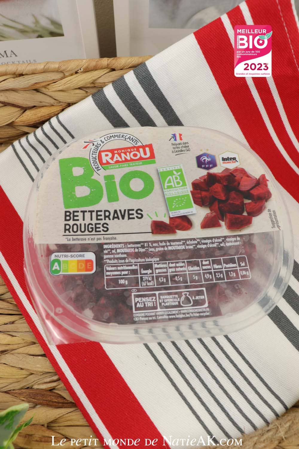 Monique Ranou est une marque du groupe Les Mousquetaires, vendue chez Intermarché. Nous avons découvert deux salades certifiées AB : les betteraves rouges bio assaisonnées avec un nutri-score de A. Mon mari et moi-même avons trouvé que cette préparation manquait de saveur : c’est bon, mais cela n’a rien d’exceptionnel. Pourtant cela était prometteur avec la présence d’échalote, agrémenté d’une vinaigrette et de moutarde de Dijon, mais cela n’a pas répondu à nos préférence culinaires. Notons que si cela est préparé en France, les betteraves ne sont pas issues de l’agriculture française. Cette proposition a visiblement plu puisqu’elle a été primée Meilleur Bio 2023.