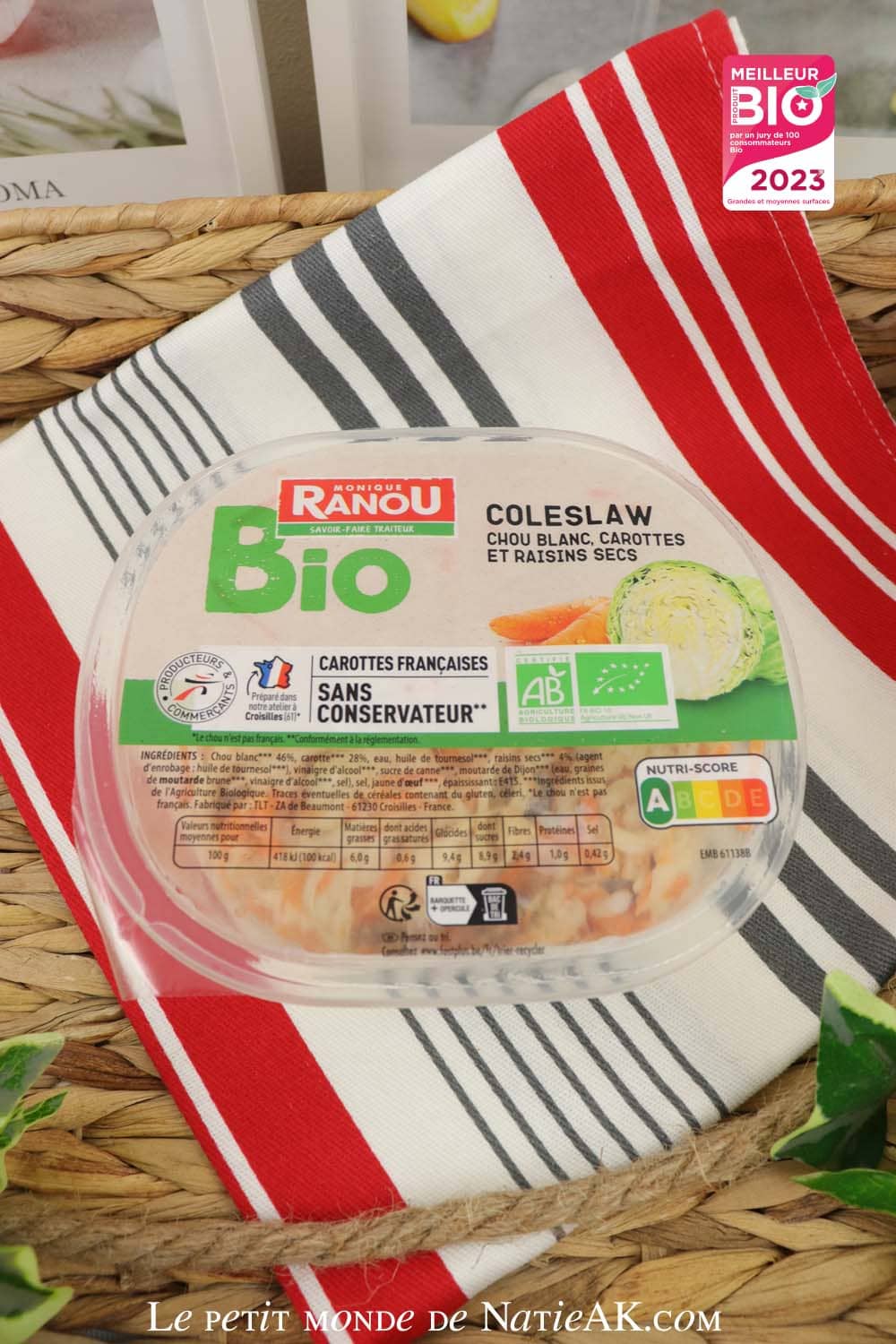 ⇒ La salade coleslaw chou blanc, carottes et raisons secs bio Monique Ranou est vendue à  à 1,50 €.