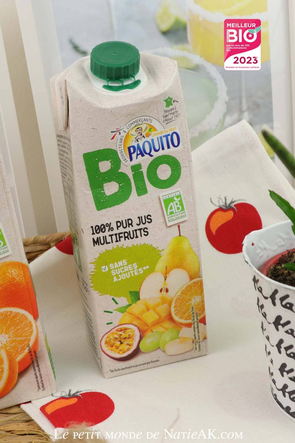 Paquito propose aussi un jus Multifruits mais là encore, nous avons trouvé qu’il manquait de personnalité. La sélection de fruits est intéressante, mais le goût n’a rien de particulier.  Si j’apprécie le sans sucre ajouté, la certification bio, ce jus n’offre rien de plus qu’un jus lamba. J’insiste que le fait que le goût n’est pas mauvais, mais il manque un quelque chose pour avoir envie de l’acheter. Lui aussi a été primé Meilleur Bio 2023.