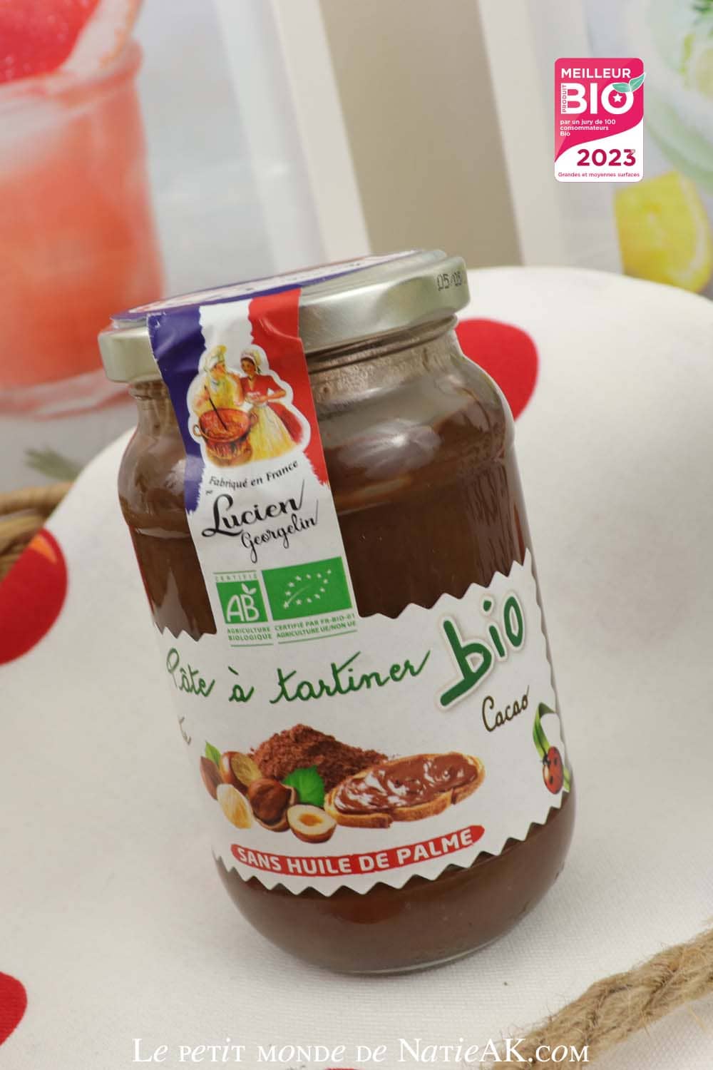 En pâte à tartiner, Lucien Georgelin nous propose une gourmandise bio sans huile de palme contenant 16% de noisette. On aimera la qualité de sa composition sans additif, ni conservateur ou huiles hydrogénées. C’est une pâte à tartiner qui offre un bon goût, mais je ne vous cache pas préférer celle de Bonne maman, plus riche en noisette (20%) et avec une pâte qui me convient mieux, celle de Lucien Georgelin  étant plus liquide. Ceci étant, le jury l’a apprécié puisqu’elle est lauréate Meilleur Produit Bio 2023.