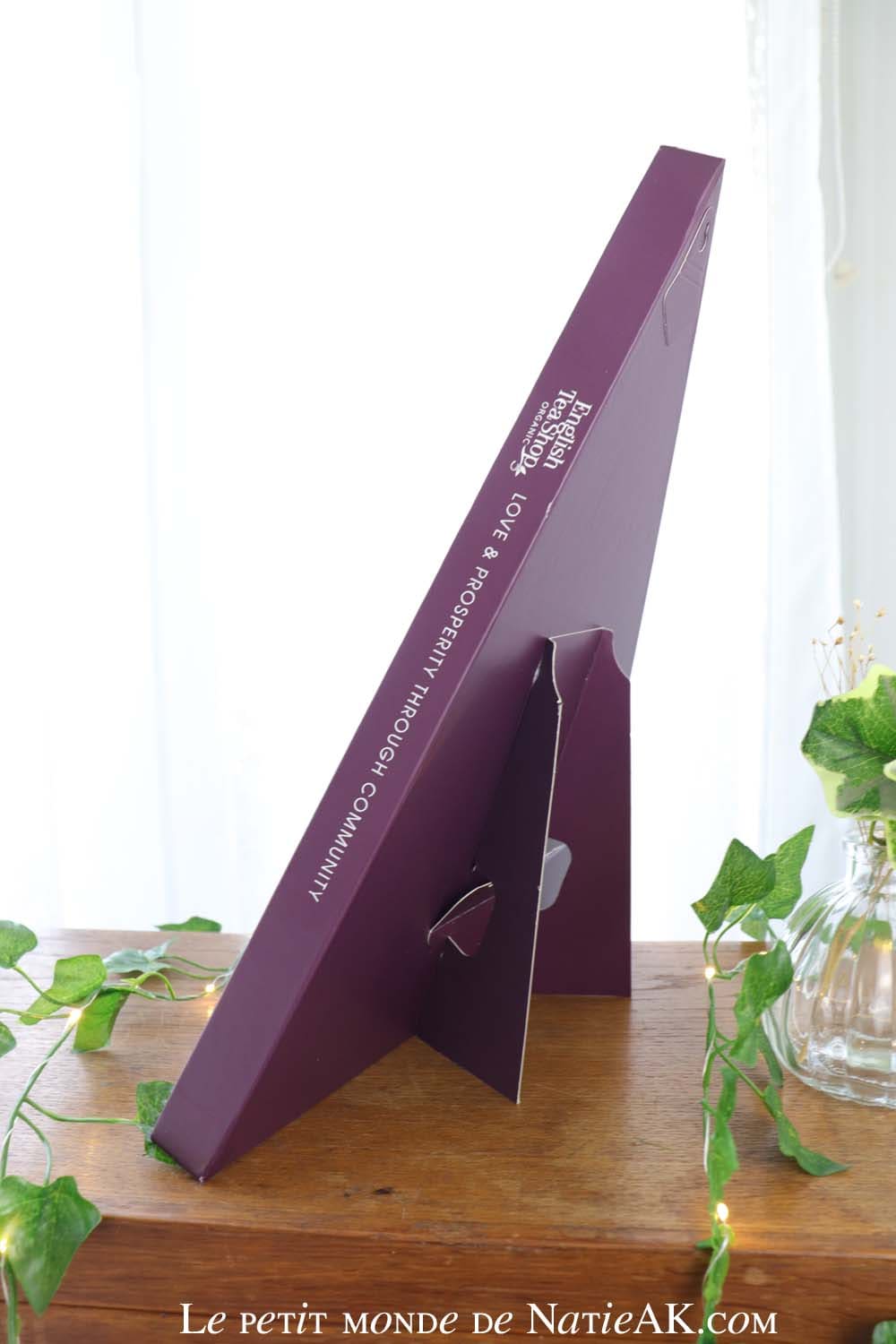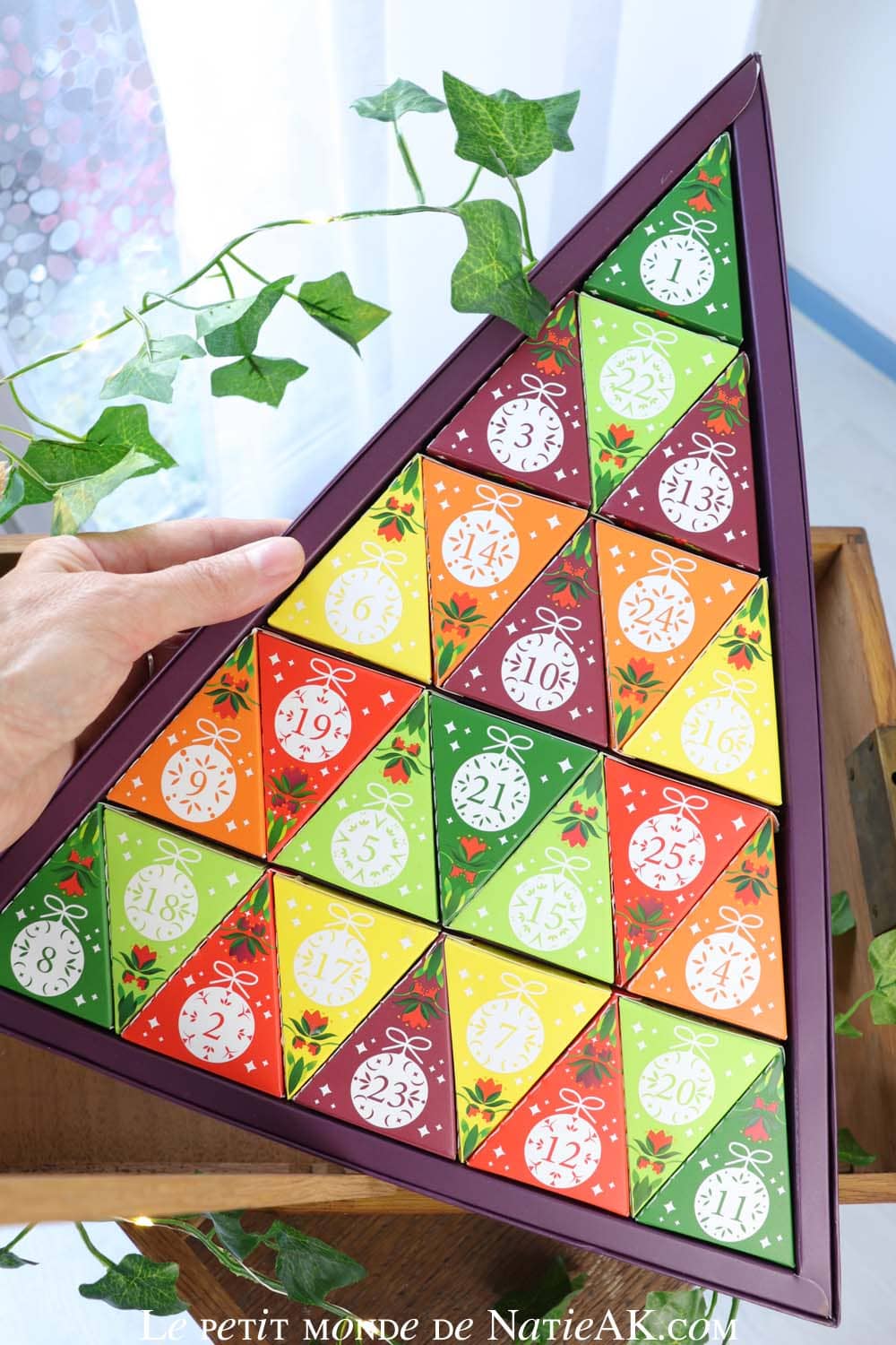 Une fois le coffret protecteur retiré, on découvre les 25 cases numérotées, joliment présenté dans un triangle pourpre qu’on peut maintenir debout tel un cadre photo grâce à un pied cartonné. Les couleurs de chaque case sont joyeuses et la senteur qui se dégage très agréable. C’est clairement une merveille qui procurera une joie à chaque dégustation.