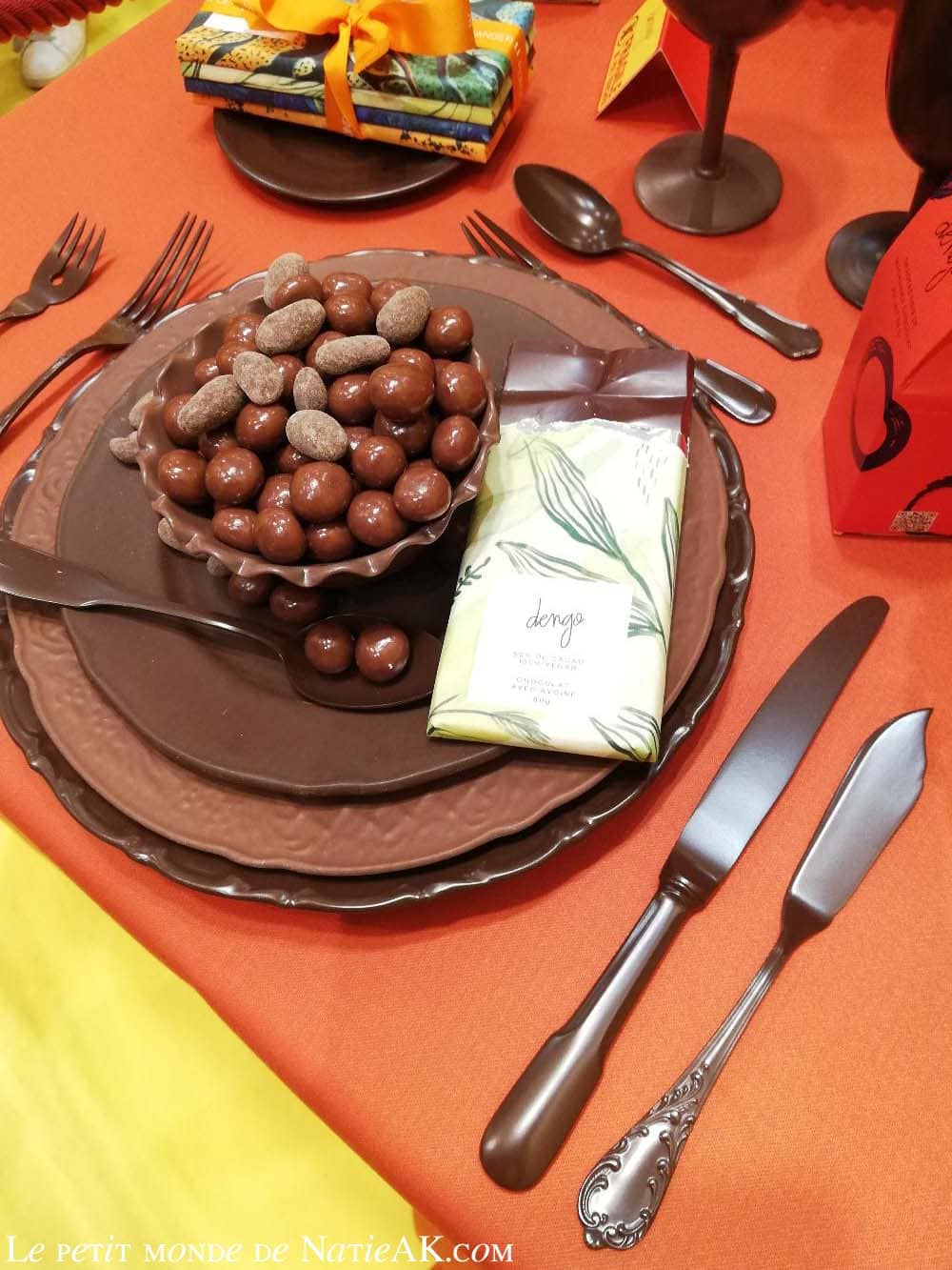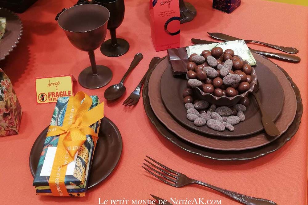 J’ai aussi été attirée par le chocolat écoresponsable brésilien Dengo : cette marque créée il y a 5 ans, souhaite améliorer les conditions de vie des producteurs en leur proposant une meilleure rémunération si ils acceptent de ne pas faire travailler les enfants, et de cultiver les cacaoyers sans déforester. Admirez ce magnifique service tout en chocolat : une beauté !