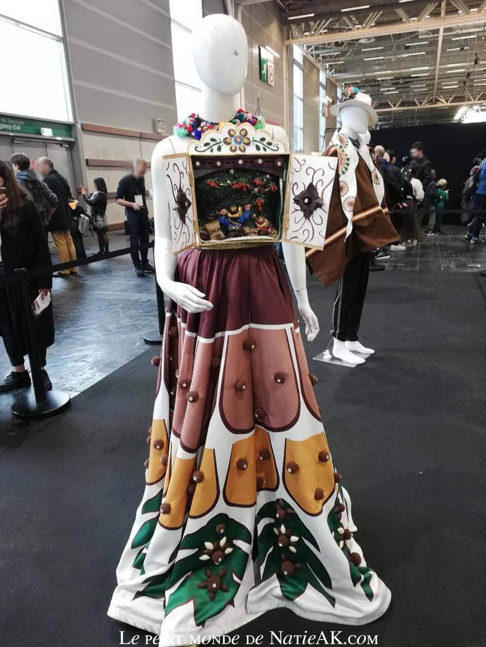 Photo ci-dessus à gauche : autre belle création mettant en avant l’art péruvien, avec la tenue du chef chocolatier Nicolas Morin et le gérant chocolatier Christophe Bertrand de la marque La Reine Astrid. Ces derniers se sont associés au créateur de mode péruvien Ricardo Dávila. Cette robe en chocolat est inspirée de la récolte du cacao et les retables d’ayacucho, un art populaire andin caractérisé par des pièces en bois rectangulaires, taillées à la main. C’est une superbe tenue colorée qui m’a donné envie d’en connaître plus sur l’art péruvien. Je vous invite à lire ce bel article sur les retables d’Ayacucho.