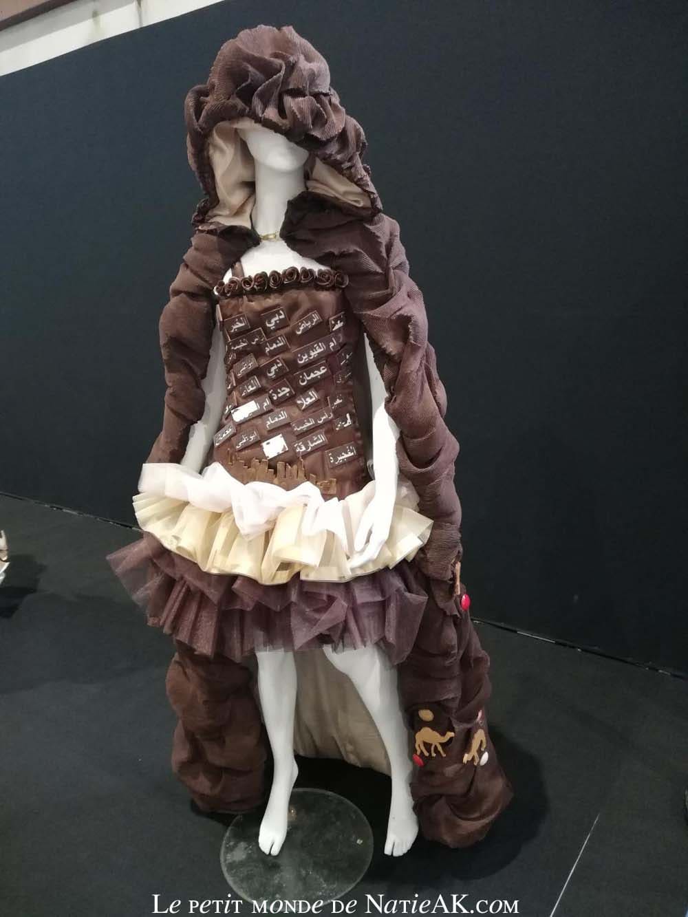 Photo ci-dessus à droite, passons à la robe confectionnée par Justine Croiser qui étudie à l’école de mode Esmod Dubai et du chef chocolatier Bernard Charles pour la maison Bateel. La cape et aussi belle que la robe !
