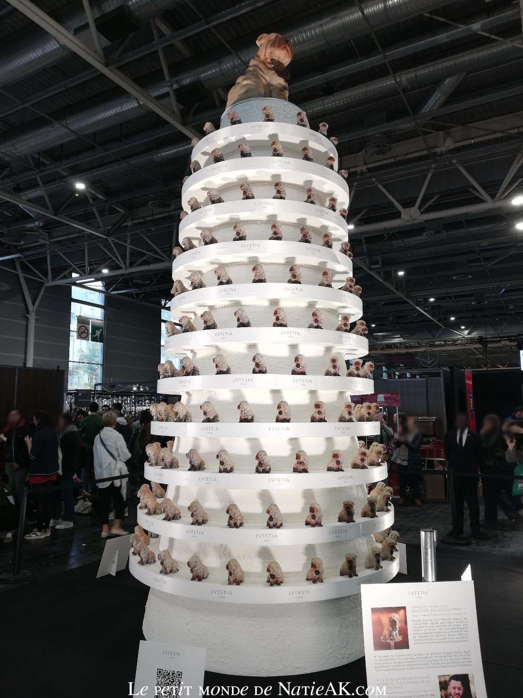 Chaque année, nous découvrons une oeuvre en version XXL : après la Cristalline de cacao en 2022, voici la proposition du chef pâtissier Nicolas Guercio de l’hôtel Lutetia Paris. Cette structure géante de 5 m de haut est tout simplement une montagne de chiens en chocolat. Il contient 216 chiots (ce qui a demandé 1 mois de travail à l’apprentie chocolatière du chef) : des mini Shar-Peis, mascotte du Lutetia placé sur une plateforme tournante, sans oublier le maxi chien à son sommet !