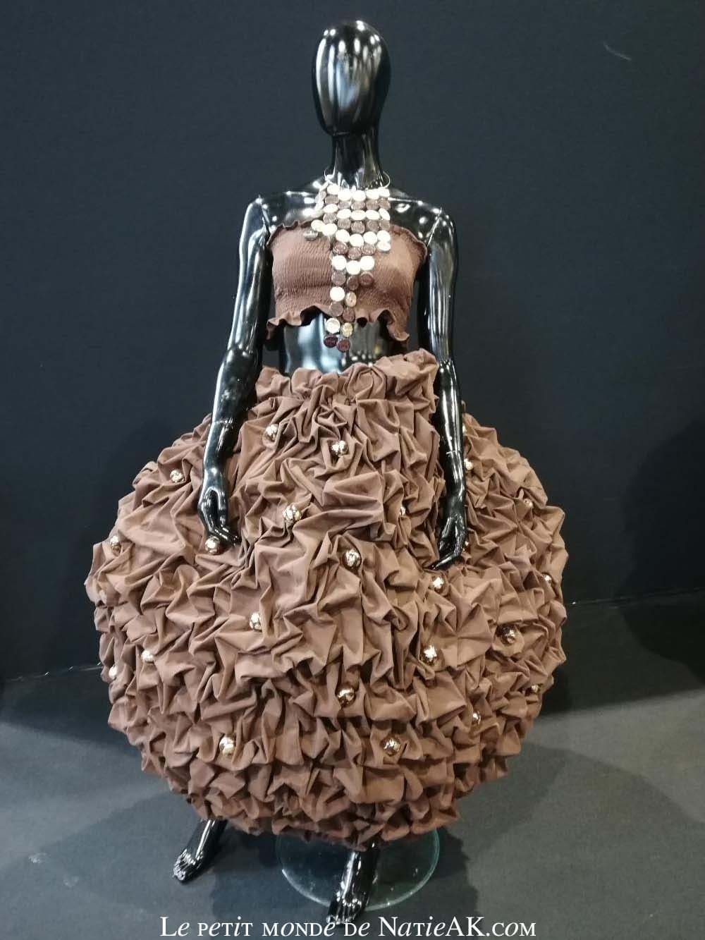 Photo ci-dessus à droite : passons à la création du Meilleur ouvrier de France et également Champion du monde de pâtisserie Pascal Brunstein. Ce dernier – qui a créé sa marque de chocolat bio et personnalisable Ocacao – s’est associé aux créateurs Maud et Nathan Brunstein pour imaginer cette robe bustier à la forme tout en rondeur pour plus de gourmandises.