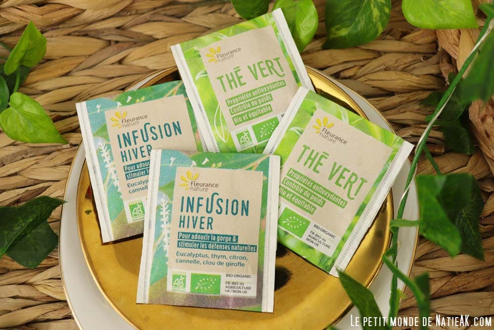 Le calendrier contenait deux complexes pour diffusion aux huiles essentielles BIO. Une formulation Détente pour offrir un moment de relaxation et un complexe Air Pur pour assainir la maison tout en offrant une senteur agréable. Pour les utiliser, Fleurance Nature a eu la bonne idée de les associer à un diffuseur à galet aromatique. Il suffit de déposer sur ce dernier 6 à 10 gouttes d’huiles essentielles. C’est une présentation pratique et facilement transportable d’une pièce à l’autre et même en déplacement ou lors d’un séjour. Nous en sommes très fan avec ma fille, si bien que je vais en racheter. Le calendrier de l’avent proposait aussi une sélection d’infusions et de thés qui ont fait le bonheur de mon mari.