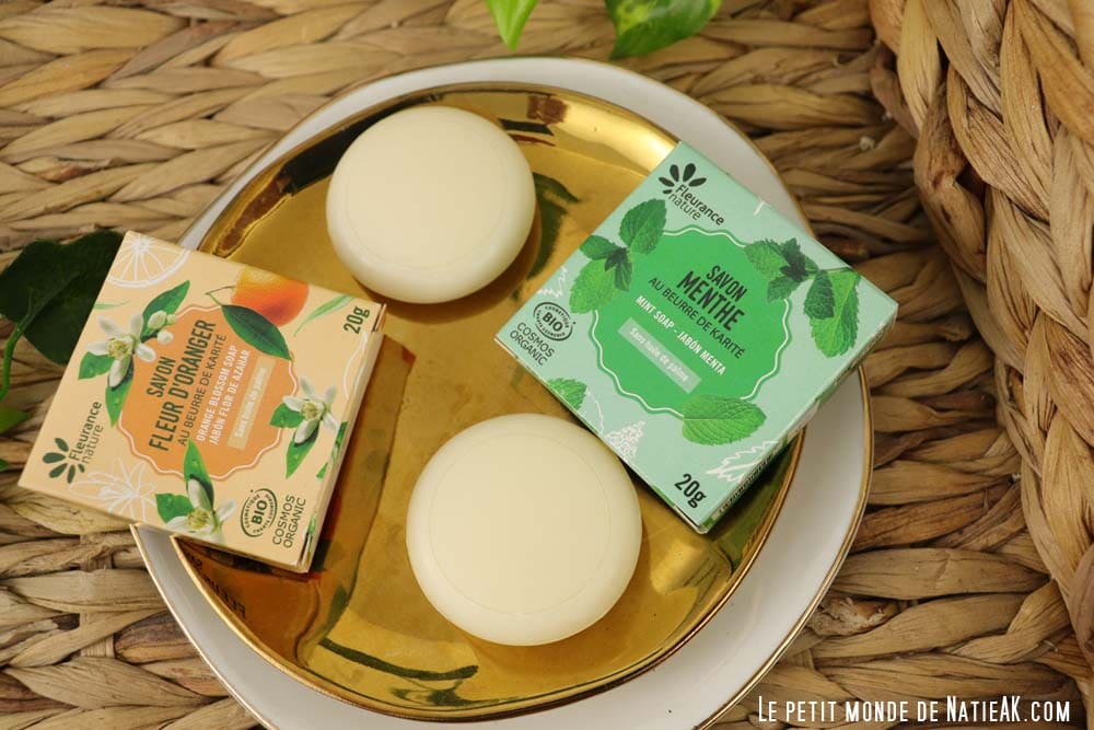Voilà encore deux soins lavants qu’on appréciera lors des vacances. L’un est un savon menthe au beurre de karité et l’autre un savon Fleur d’oranger au beurre de karité en format 20g. Ils contiennent tous les deux 99 % d’ingrédients d’origine naturelle dont 73 % d’ingrédients biologique. Je suis impatiente de les tester !