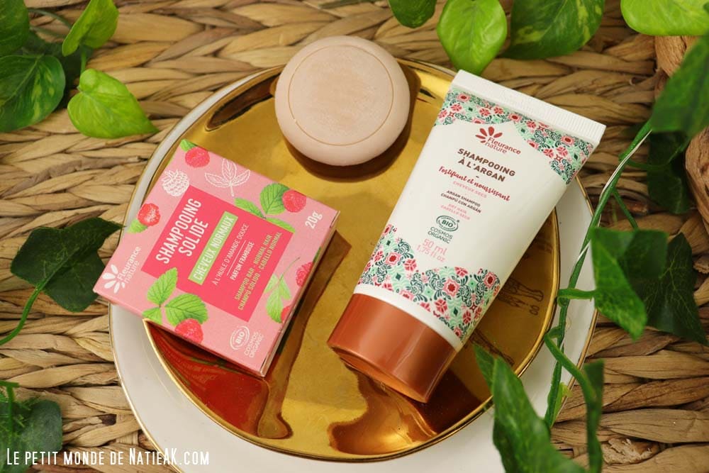 Passons aux deux shampoings Bio pour cheveux : un en format liquide (50ml) à l’argan pour fortifier et nourrir les cheveux secs, et un en format solide (20gr) à l’huile d’amande douce parfum framboise pour cheveux normaux. Ils sont tous les deux vegan et labellisés Cosmos organic. Tous deux seront très pratiques à glisser dans une valise autant lors d’un déplacement professionnel, ou d’un week-end de détente.