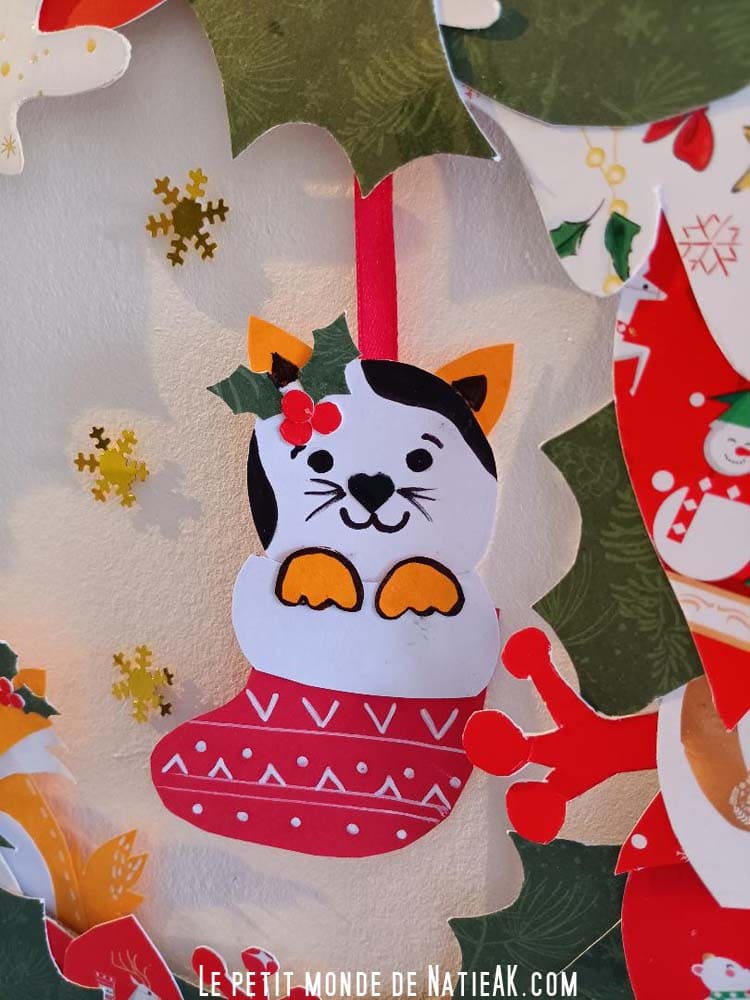 J’ai donc uniquement placé le renard et suspendu le chat avec un ruban, en les fixant tous les deux avec du scotch. Vous remarquez que j’ai motifié les patounes et les oreilles du chat à la dernière minute.