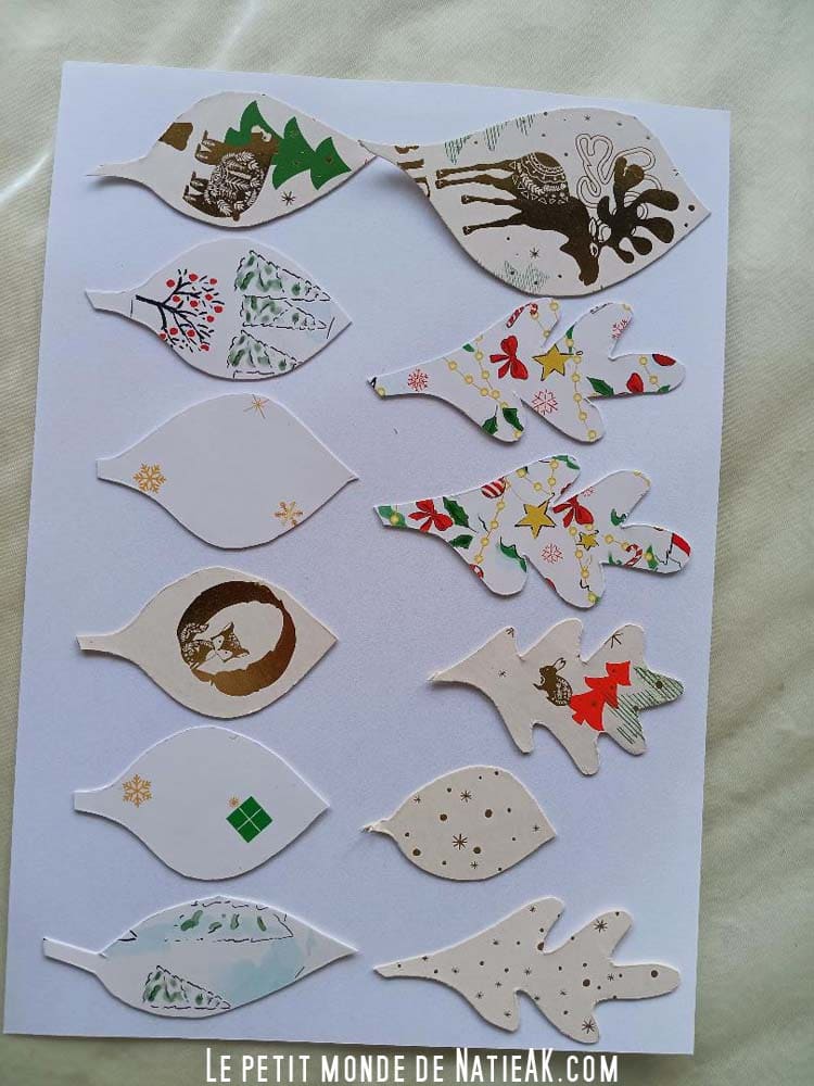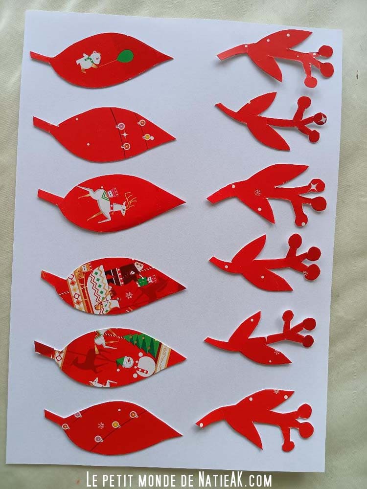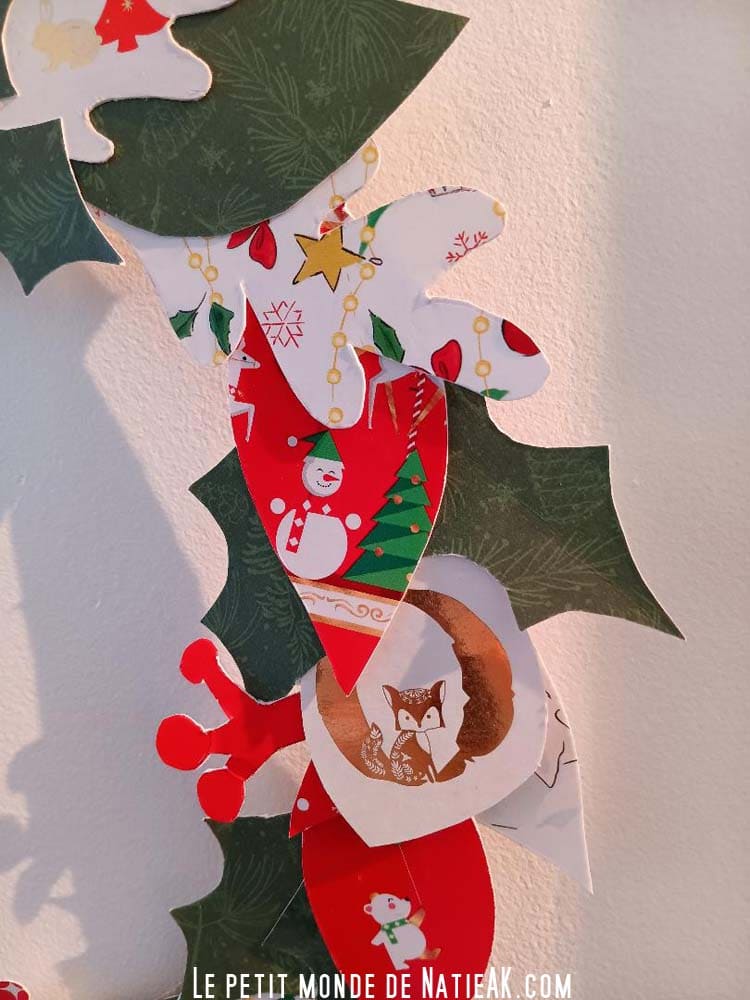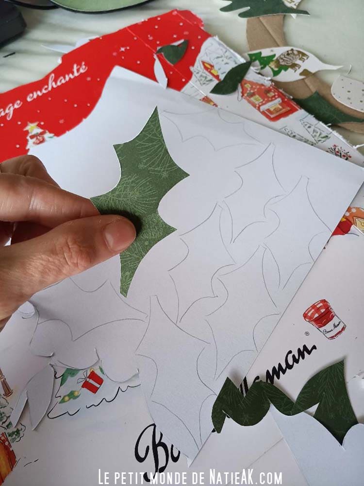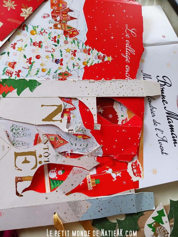 2/Les différents motifs : j’ai recyclé d’anciennes éditions de calendriers de l’avent, en l’occurrence l’édition 2021 de L’Atelier du chocolat et Bonne maman, ainsi que des chutes de feuilles vertes. Pensez à réutiliser le papier cadeau, les emballages de chocolats, les sacs en papier…