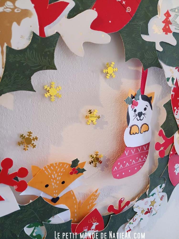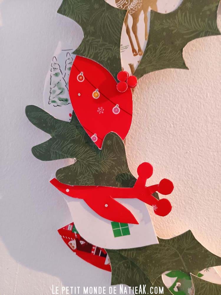 3/J’ai ensuite disposé les différents motifs sur la base en carton, en veillant à créer une belle harmonie de couleurs et de formes. Pour éviter de surcharger le centre de la couronne de Noël, j’ai décidé de ne pas placé le renne : il sera recyclé dans un autre projet !