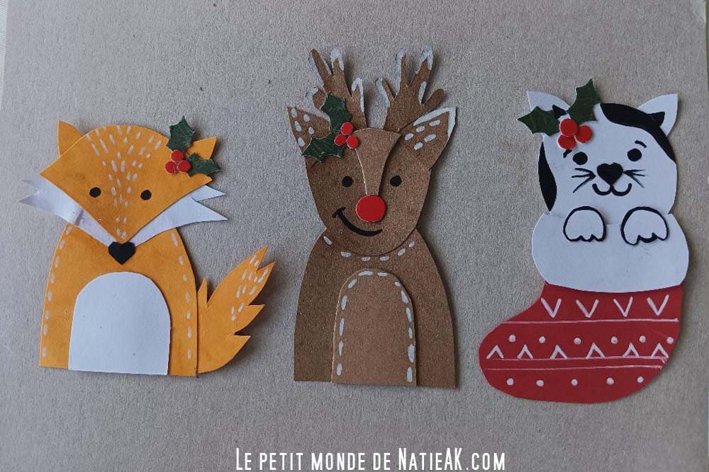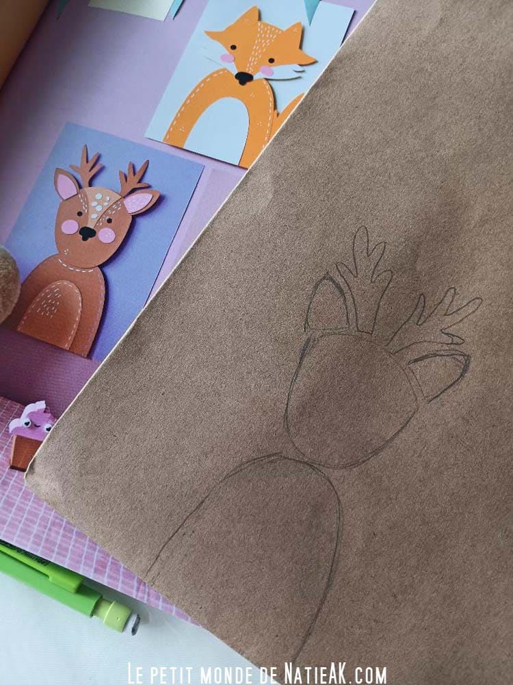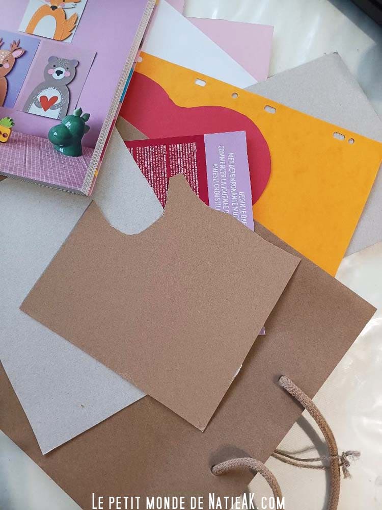 Pour réaliser les animaux, j’ai utilisé un intercalaire orange, un sac en papier kraft, des emballages alimentaires, du papier blanc, des calendriers de l’avent, ainsi qu’un stylo marqueur blanc.