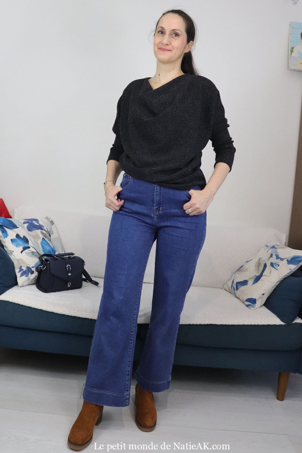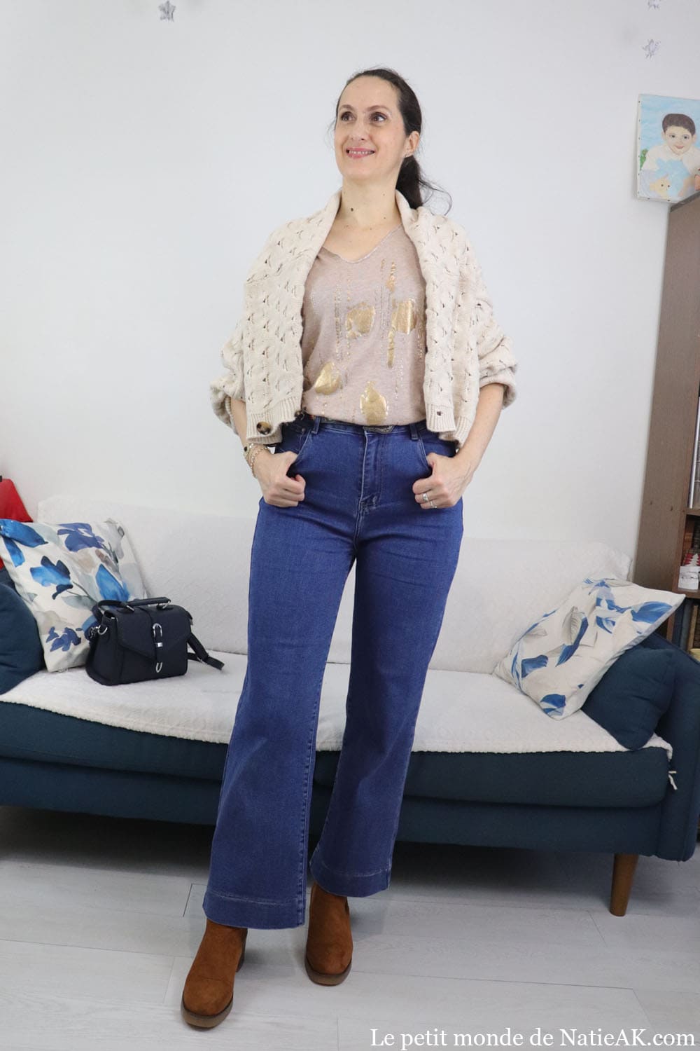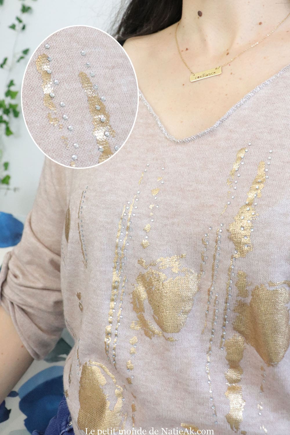 Mais revenons à ce pull : à la lumière, les motifs abstraits dorés, ainsi que les strass jouent avec la source lumineuse. Cela offre de belles nuances, ce qui apporte à ce haut beaucoup de joyeuseté. J’aime tout autant le tissu tout doux sur la peau et sa souplesse, et ses manches retroussables, qu’on peut mettre en version longue si on le souhaite. Il est parfait avec ce gilet ample.