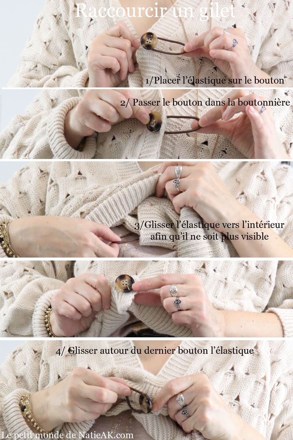 Afin d’allonger la silhouette, on peut raccourcir un gilet long. Il existe plusieurs astuces pour y parvenir, dont celle de l’élastique à cheveux. Mon gilet ayant que 4 boutons, j’ai placé l’élastique sur le 1er bouton : libre à chacun, selon le rendu que l’on souhaite et le nombre de boutons, de placer l’élastique à la hauteur désirée.