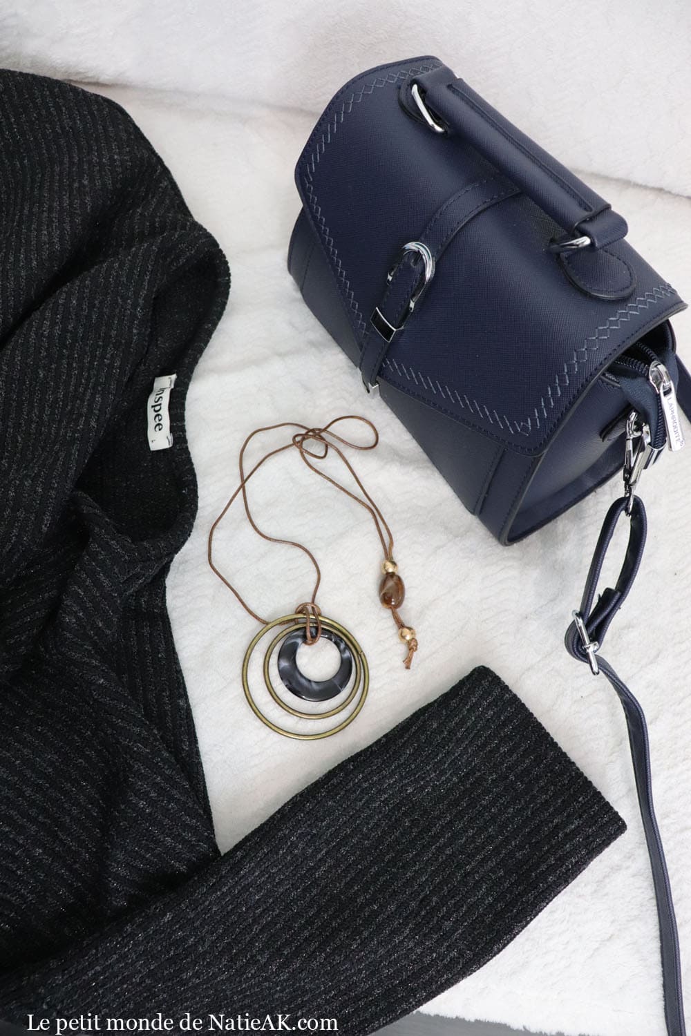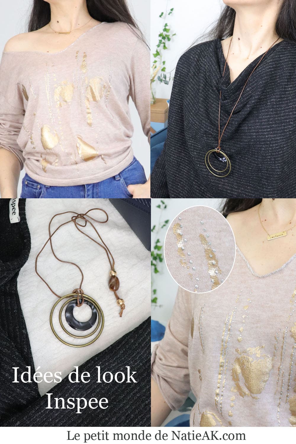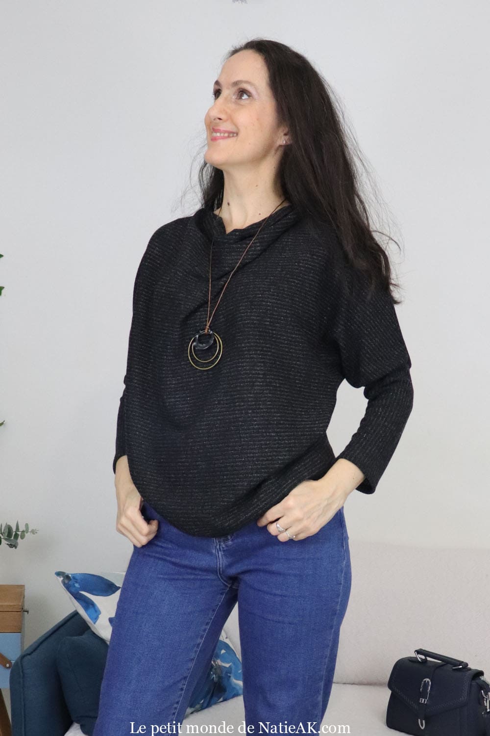J’aime tout autant son tissu irisé qui scintille à la lumière sans faire boule à facettes : juste ce qu’il faut pour apporter de la brillance sans excès. Ce pull est fourni avec un sautoir avec à son extrémité trois cercles de différentes tailles positionnées sur un cordon. Son entretien est très simple : 30° en machine, séchage rapide et en plus, il ne se froisse pas !