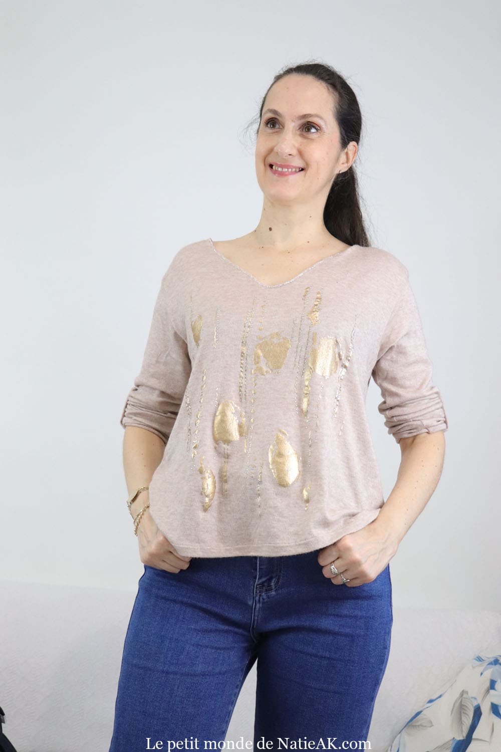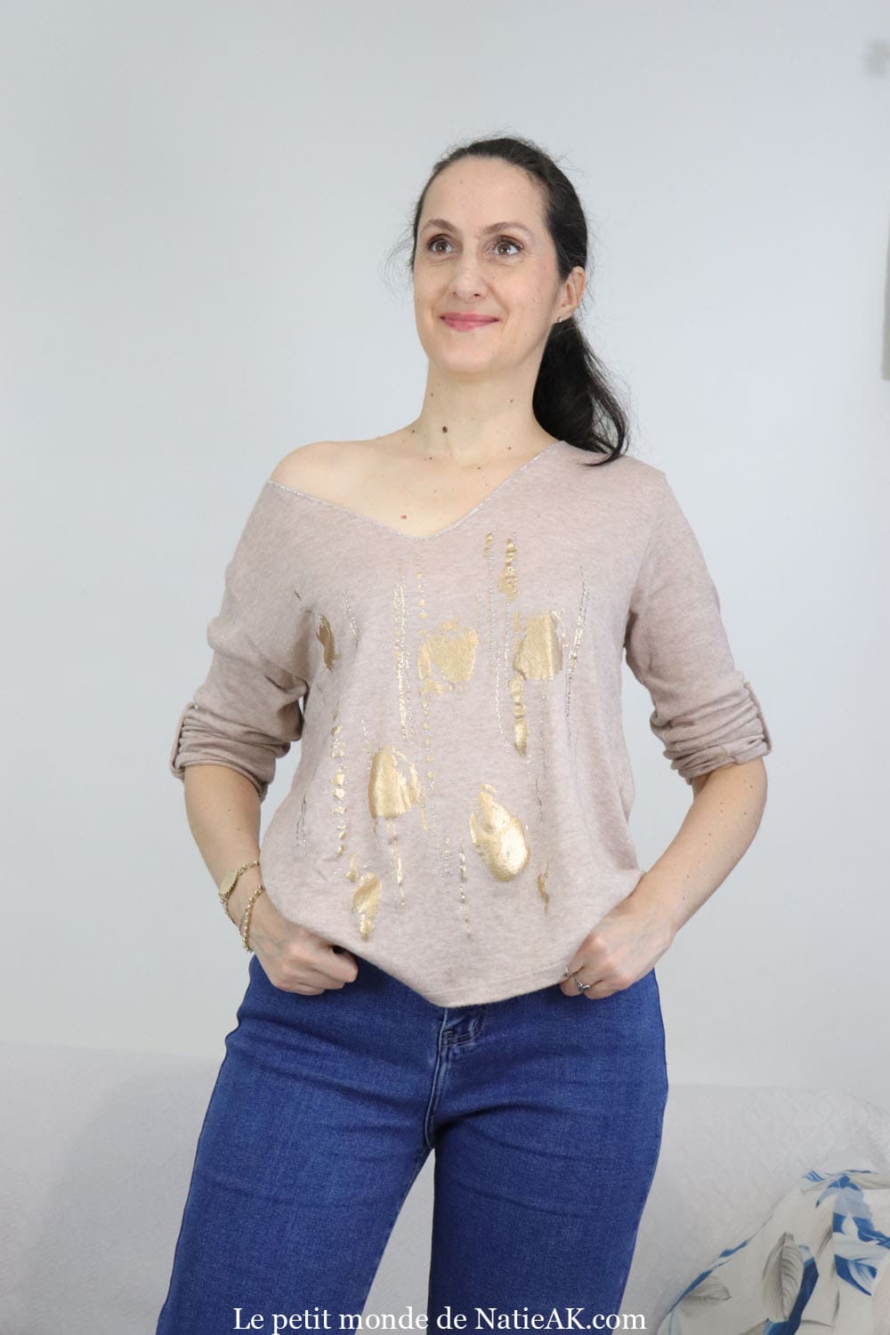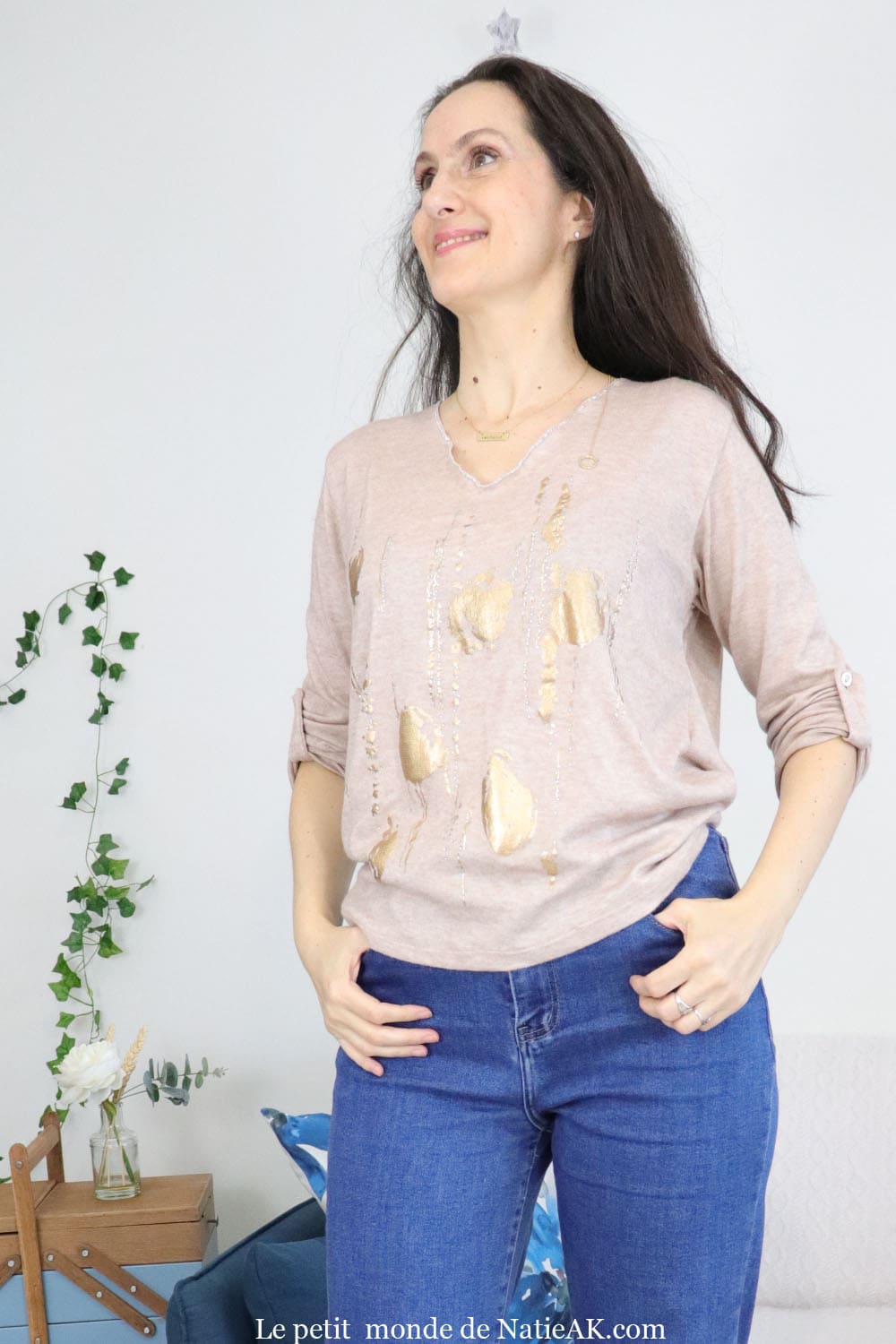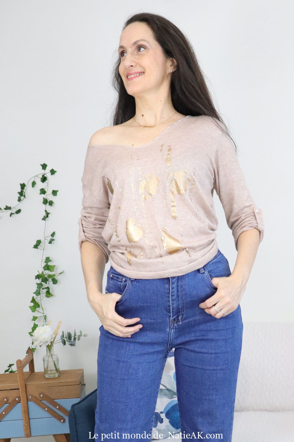 Avec cette version, je porte un pull fin à manche longues retroussables. De fabrication italienne, cette pièce offre une coupe droit avec une encolure en V irisé, ainsi qu’un flocage doré orné de strass. J’aime particulièrement la technique du flocage comme vous avez pu le voir avec la sublime 👉blouse flocage plumes irisées.