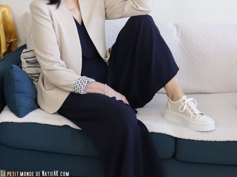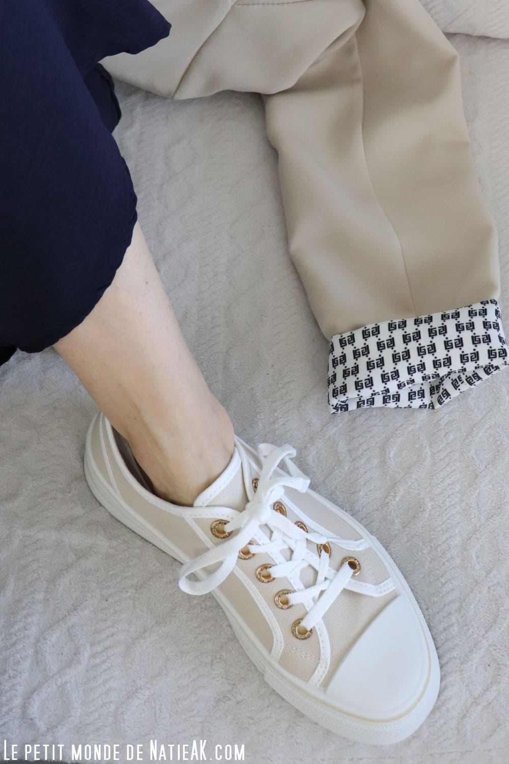 J’ai opté pour cette paire de baskets pour un look décontracté et moderne. Je vais gagner quelques centimètres, puisque la hauteur de la semelle fait 4, 5 cm. Je ne l’ai pas spécialement choisi pour me grandir (je fais 1 m 73), mais pour sa couleur qui offre un joli rappel avec la veste, et les liserets et les oeillets ornés de strass qui apportent des détails originaux. La pointure 39 me va bien avec une petite paire de chaussettes basses : de toute façon, je n’aime pas porter des baskets en ayant les pieds nus. Et vous ?