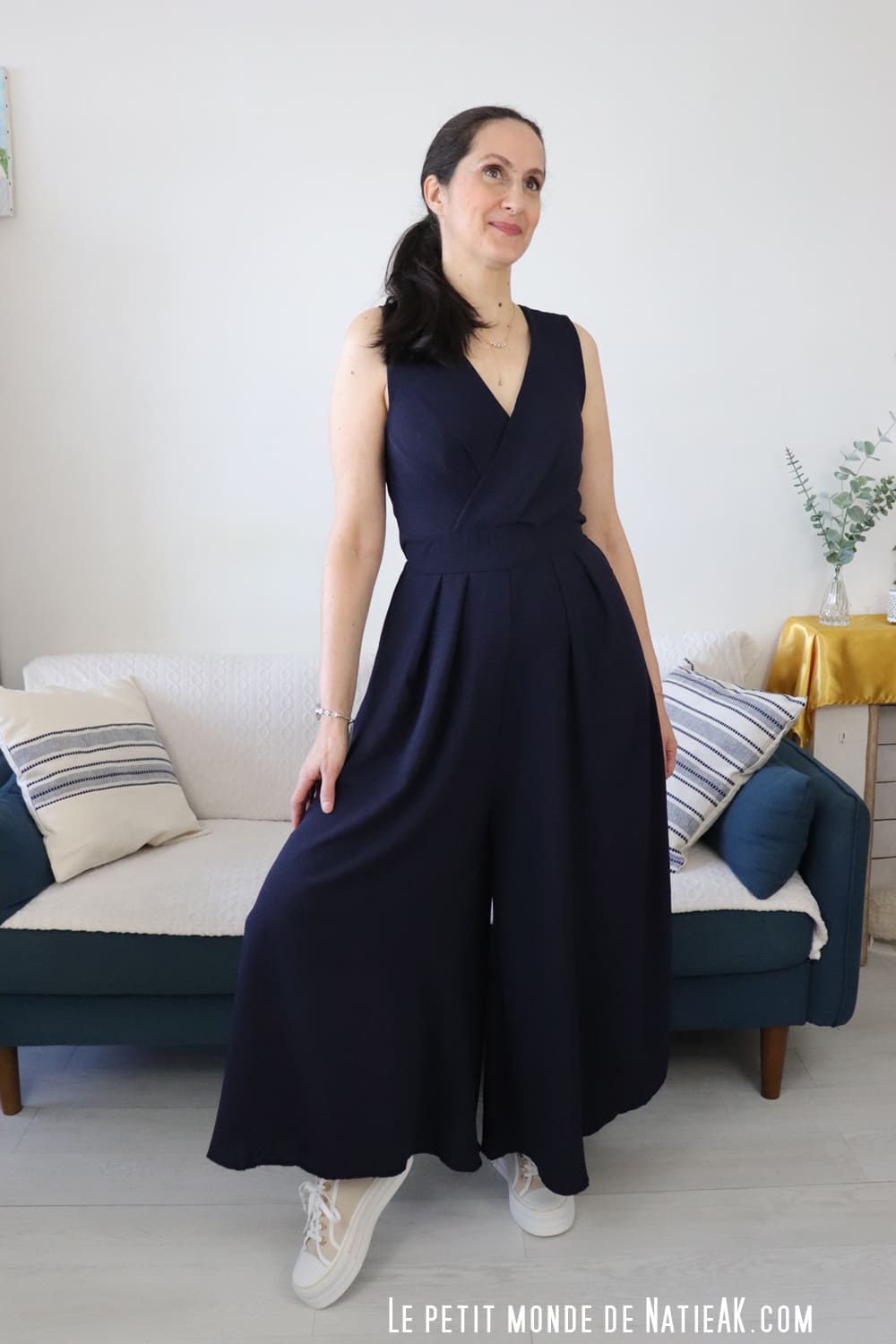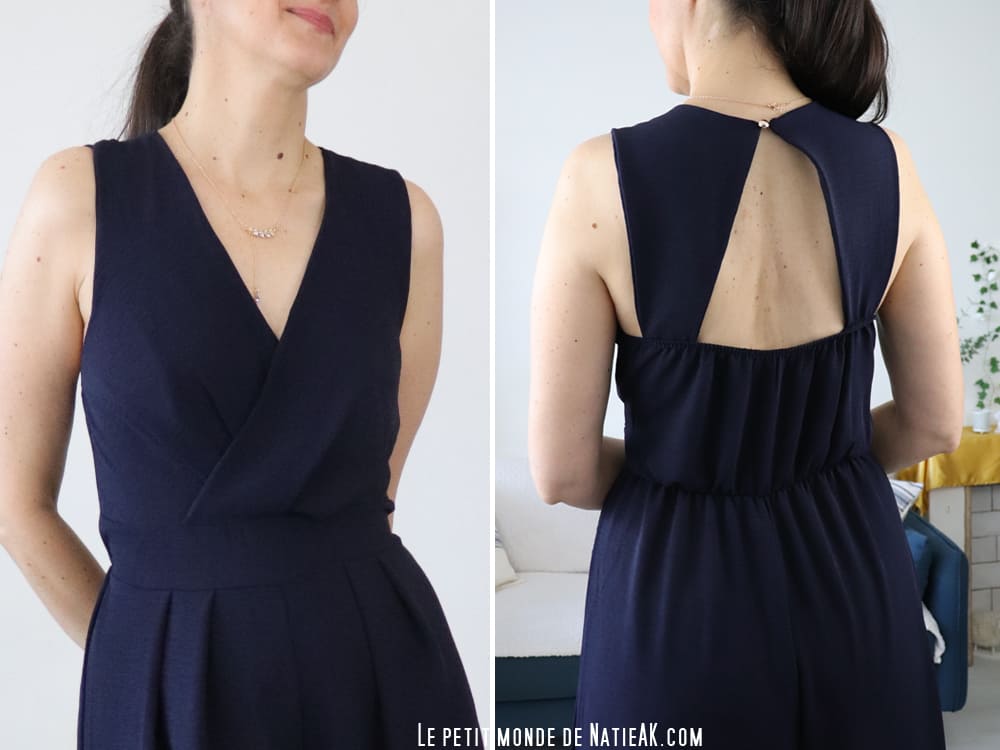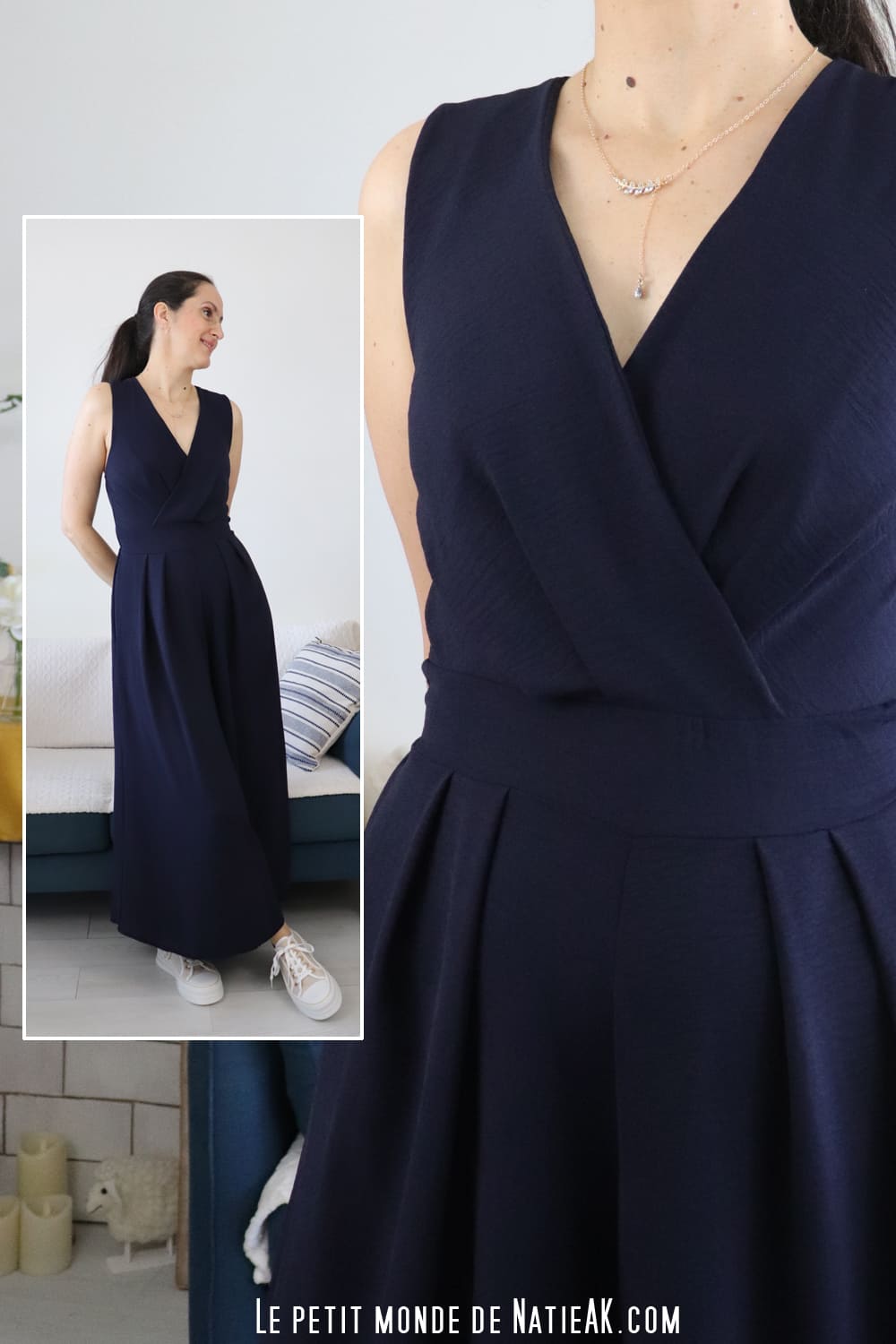 Commençons par le haut de la combinaison : un décolleté cache-cœur et un dos nu : la coupe glamour accompagne les courbes sans aucune vulgarité. C’est à la fois élégant, chic, terriblement féminin tout en étant confortable, grâce à un tissu fluide et léger qui sera tout aussi agréable en été.