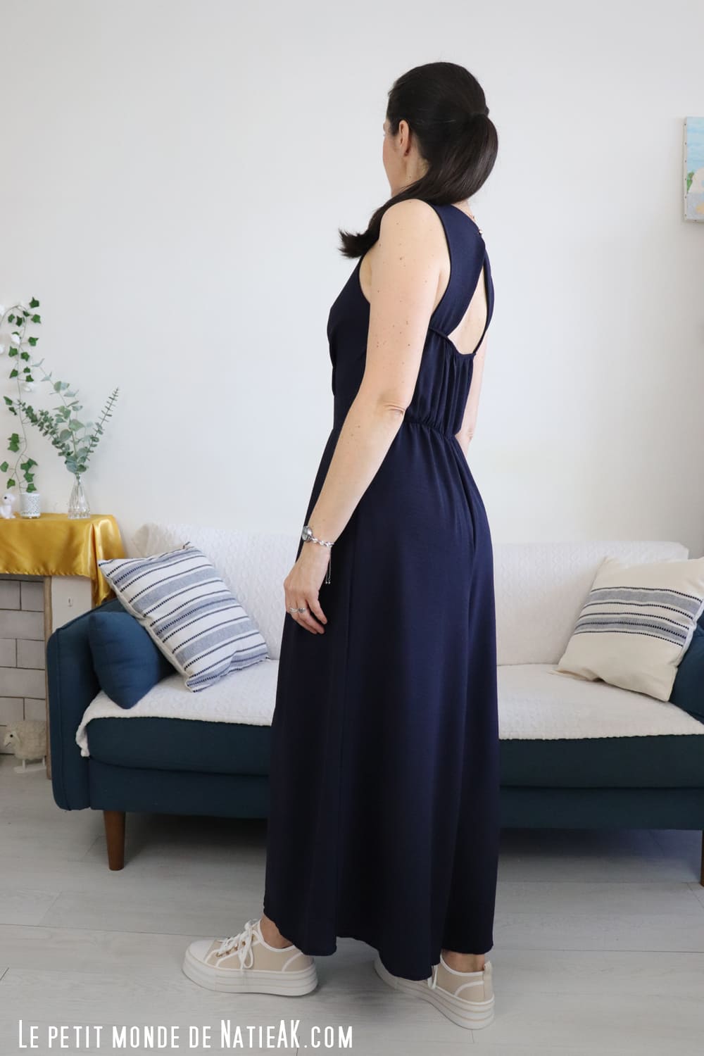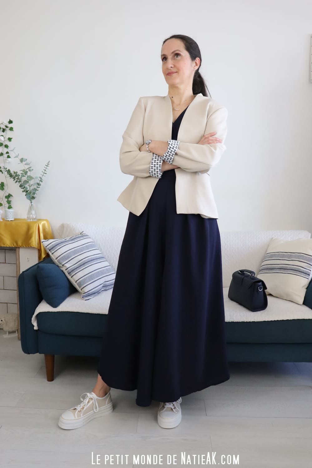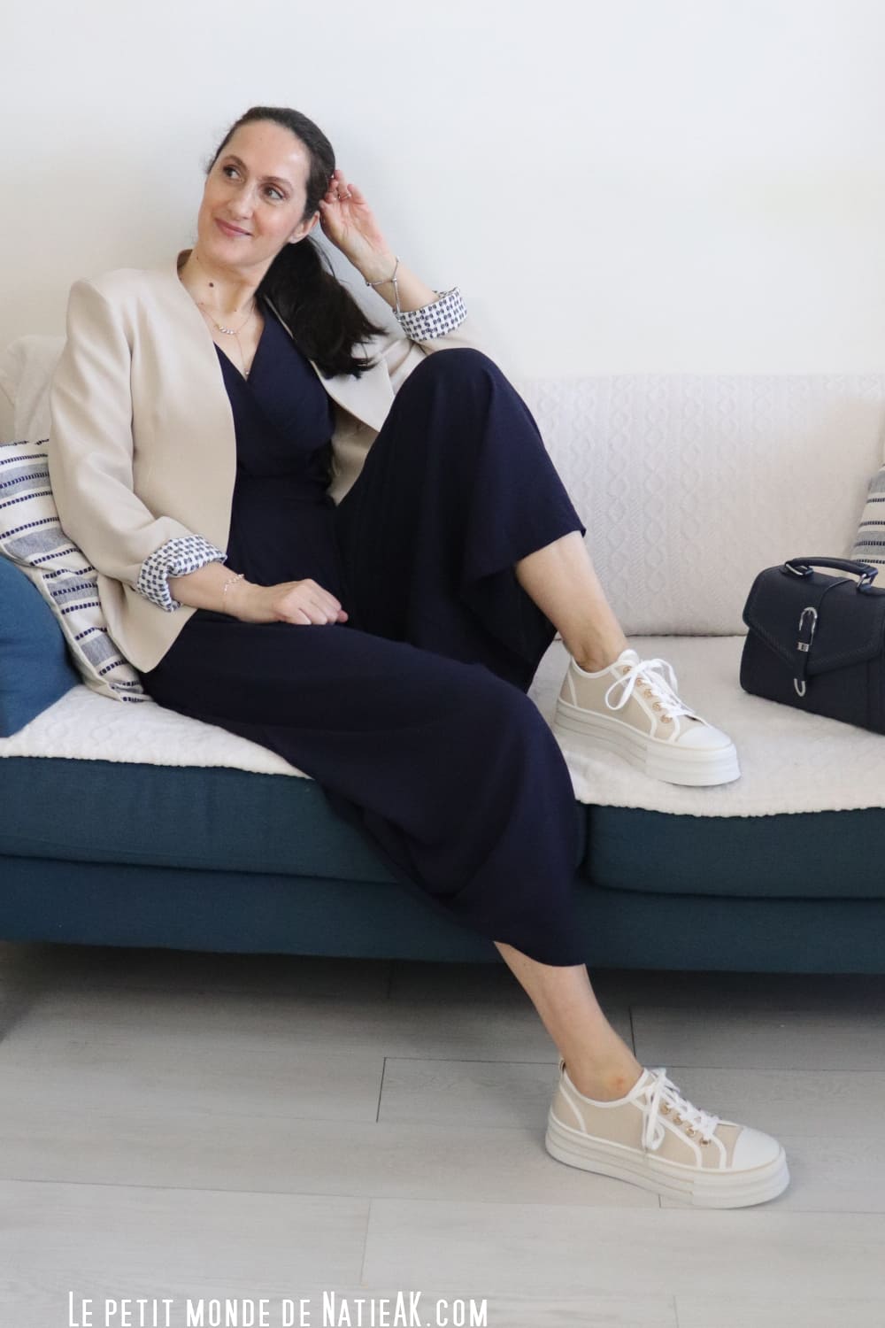 Sur la partie du bas de la combinaison, la taille est marquée par une coupe élastique pour préserver le confort, tout en soulignant la féminité des hanches, pour finir par une coupe large au niveau des jambes, donnant l’impression visuelle que l’on porte une longue robe. Je l’adore : elle va clairement m’accompagner durant toute la saison printemps/été !