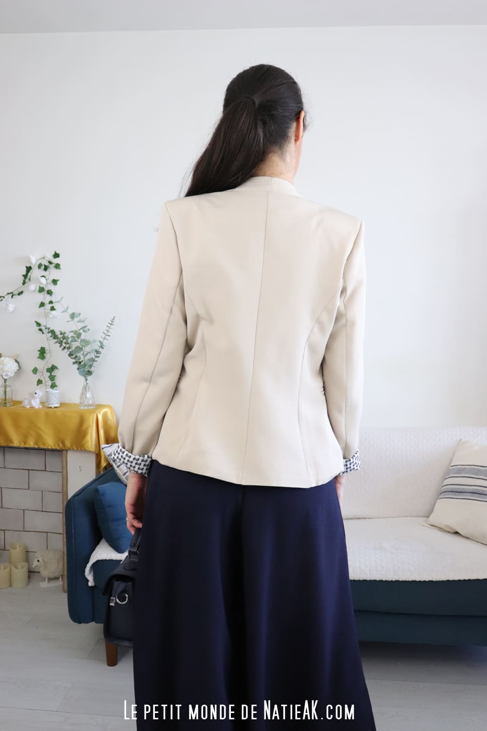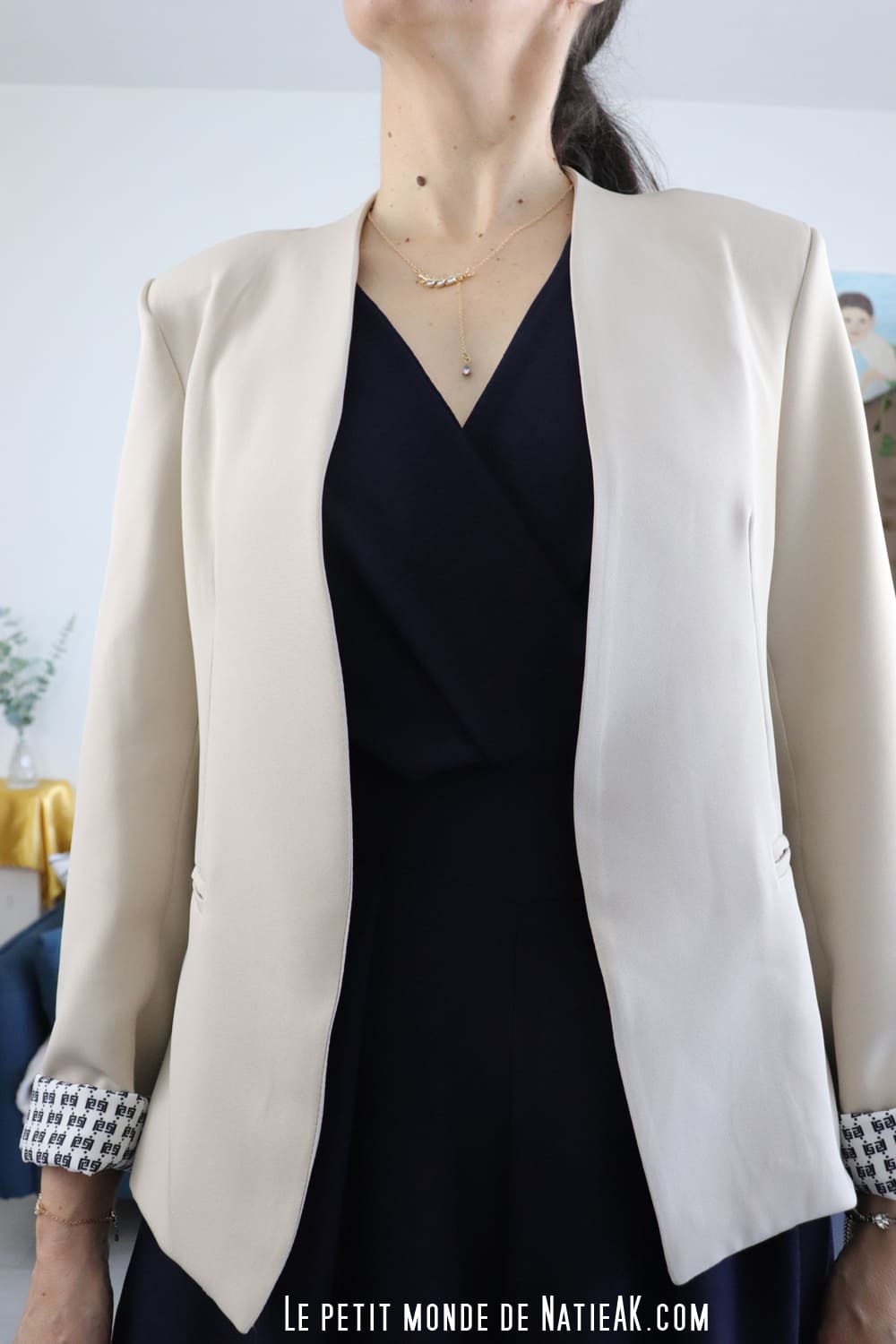 Pour l’accompagner, j’ai choisi une veste fabriquée en Italie en teinte beige : sans bouton, avec deux fausses poches, sa coupe droite peut paraître assez classique, mais l’extrémité de ses manches renferme une belle surprise. En effet, le revers des poignets laisse apparaître un